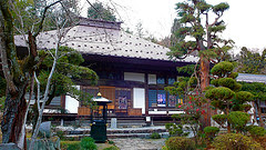 Temple No.25 Kyusho-ji. With a red gate, the Kannon Hall set back behind the lake is late Nineteenth Century. Behind it is a fishing pond filled with water lilies that undoubtedly looks remarkable during summer. The foreground pond was iced over with blue and yellow wrens/wagtail birds hopping on the surface of the ice crust. The buildings were a mixture of recent or recently restored and rustic-looking faded old carved wooden buildings. Due to the Temple's talisman, a large rock with a swirl on it, said to have been originally given to Emma (who is Emma?) by the