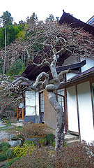 The pool and receptacle for the downpipe (?) (rather down-'chain' of bronze bells actually) were frozen. The shrine itself was behind closed doors, presumably also to exclude cold and damp but one could slide back the shutters for a little glimpse inside. Apparently the principal deity of the Kannon Hall is the sensuous Nyoirin Kannon, allegedly carved by the Eight Century Chinese Emperor, Hsuan-tsung in the image of his beloved concubine, Yang Kuei-fei and the statue is said to have been brought to Japan in the Fourteenth Century by a priest from Kenchō-ji. There are other treasures in the temple such as rare Sixteenth Century nameplates of pilgrims. The chief monk's house (?) adjacent was also magnificent, adjoining the ornamental garden and bearing a majestic curved copper roof-line. Maybe life as a hilltop monk wouldn't be too bad. A huge stone lantern marks the steps to the shrine and the Kannon building nestles into a thickly wooded cyprus forest. Like in Yokoze, the neighbouring village of this Kannon, Shiroku, is renowned for its preservation of a (distinct) puppetry tradition and sometimes performances are given in village festivals, invoking older people to reminisce about the traditional arts practised in the communities before the Sino-Japan War and Pacific War that gravely changed villagers lives (according to Enbutsu).